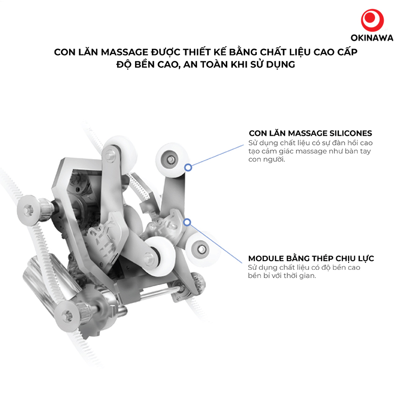Ghế massage OKINAWA OS 8500 là một trong những sản phẩm vượt trội nhất trong phân khúc có phần thiết kế con lăn bằng chất liệu silicon mềm cao cấp. Khác với các sản phẩm ghế massage thông thường, KS-950 có độ bền cao hơn, massage êm ái và rất an toàn cho người sử dụng.